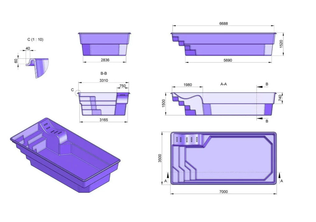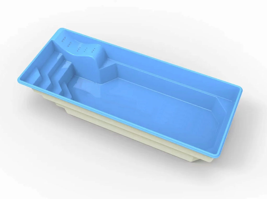Prostokątny, nowoczesny kształt. Układ stopni zapewnia komfort i bezpieczeństwo, a dodatkowa leżanka pomoże się zrelaksować i poczuć jak we własnym spa. Niecka podobnie jak pozostałe modele daje duże możliwości doposażenia w atrakcje wodne m.in przeciwprąd. Zastosowanie efektownych schodów prostokątnych zdecydowanie podkreśla walory użytkowe, ich rozmiary nie zabierają dużo z powierzchni do pływania, a ich antypoślizgowa powierzchnia zapewni komfort i bezpieczeństwo kąpiących. Dodatkowo niecka wyposażona jest w dwa siedziska na krótszej ścianie.