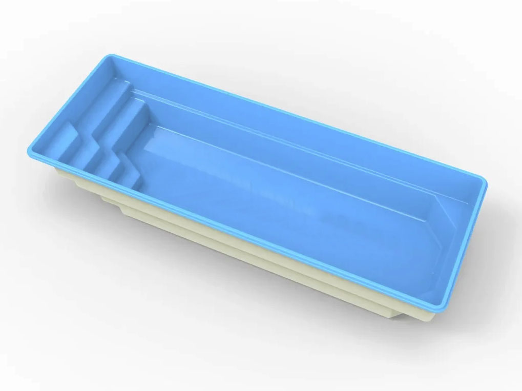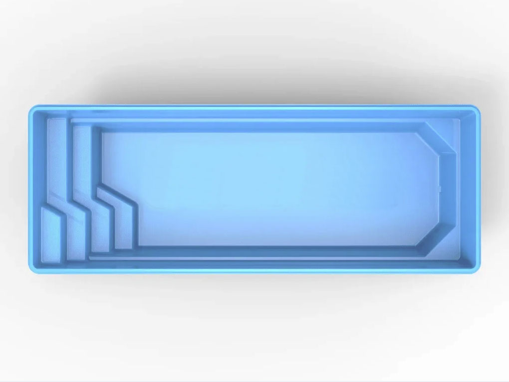 Klasyczny prostokątny kształt, ze schodkami w jednym z rogów basenu zapewni komfort pływania na większej przestrzeni. Niecka podobnie jak pozostałe modele daje duże możliwości doposażenia w atrakcje wodne m.in przeciwprąd. Zastosowanie efektownych schodów prostokątnych zdecydowanie podkreśla walory użytkowe, ich rozmiary nie zabierają dużo z powierzchni do pływania, a ich antypoślizgowa powierzchnia zapewni komfort i bezpieczeństwo kąpiących. Dodatkowo niecka wyposażona jest w dwa siedziska na krótszej ścianie.