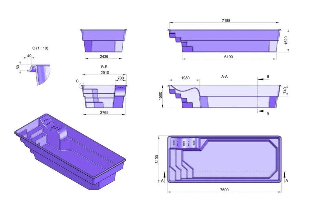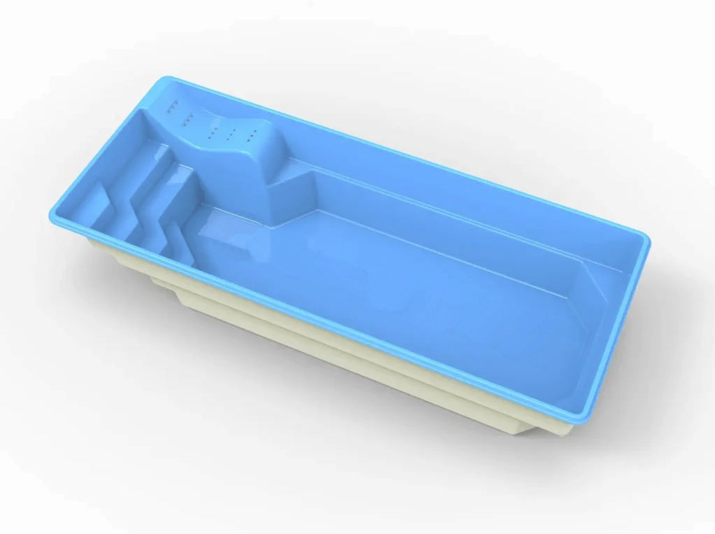 Prostokątny, nowoczesny kształt. Układ stopni zapewnia komfort i bezpieczeństwo, a dodatkowa leżanka pomoże się zrelaksować i poczuć jak we własnym spa. Niecka podobnie jak pozostałe modele daje duże możliwości doposażenia w atrakcje wodne m.in przeciwprąd. Zastosowanie efektownych schodów prostokątnych zdecydowanie podkreśla walory użytkowe, ich rozmiary nie zabierają dużo z powierzchni do pływania, a ich antypoślizgowa powierzchnia zapewni komfort i bezpieczeństwo kąpiących. Dodatkowo niecka wyposażona jest w dwa siedziska na krótszej ścianie.