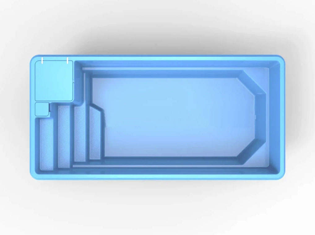 Niezwykle trwała i elegancka niecka basenowa idealna do Twojego ogrodu. Dodatkowe miejsca do siedzenia dają komfort i wypoczynek. Jej solidna konstrukcja gwarantuje długotrwałą trwałość. Wbudowana studzienka na osprzęt pozwala ograniczyć ilość miejsca potrzebnego do instalacji niecki. Niecka podobnie jak pozostałe modele daje duże możliwości doposażenia w atrakcje wodne m.in przeciwprąd. Zastosowanie efektownych schodów prostokątnych zdecydowanie podkreśla walory użytkowe, ich rozmiary nie zabierają dużo z powierzchni do pływania, a ich antypoślizgowa powierzchnia zapewni komfort i bezpieczeństwo kąpiących. Dodatkowo niecka wyposażona jest w dwa siedziska na krótszej ścianie.