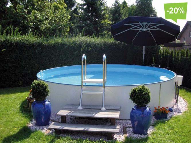 Gotowy do samodzielnego montażu basen przydomowy okrągły ogrodowy o stabilnej konstrukcji z blachy stalowej ocynkowana o grubości 0,75 mm pokryta lakierem ochronnym, od zewnątrz pokryta warstwą białego tworzywa sztucznego. Za szczelność odpowiada wkład foliowy stanowiący szczelne wykończenie niecki basenowej, wykonany jest ze specjalnej folii PCV koloru niebieskiego, grubości 0,8mm, pokryty akrylem, jest ona odporna na promieniowanie UV.