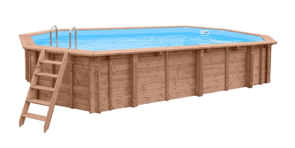 Basen drewniany podłużny DIAMOND. Na wyposażeniu znajduję się drewniana zdejmowalna drabinka zewnętrzna wyposażona w stopnie antypoślizgowe. Ruchoma deska z zawiasem jaką tu zastosowano ułatwia oczyszczanie skimmera z zewnątrz. Struktura zewnętrzna wykonana z sosny impregnowanej do klasy IV. Obrzeże basenu wykończone deską tarasową potrójnie ryflowaną mocowaną do struktury niecki na nowy wkręt tarasowy.