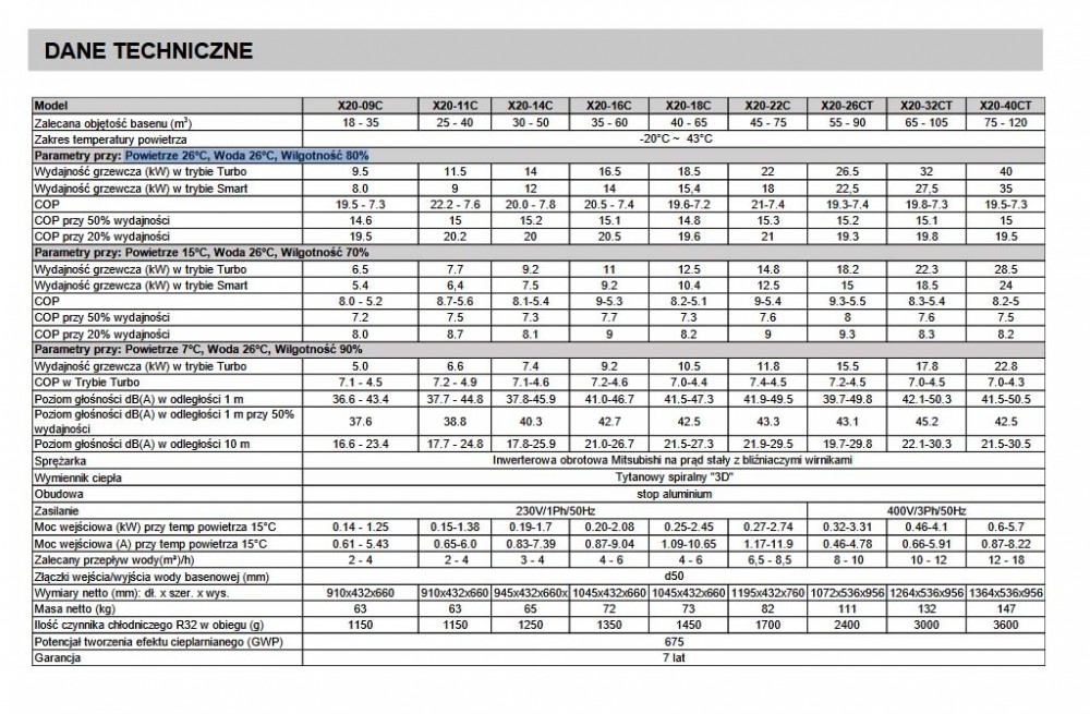 Zastosowana technologia i podzespoły japońskiej firmy Mitsubishi potwierdzają, że mamy do czynienia z urządzeniem solidnym i energooszczędnym. Pompy Inver X20 w sposób płynny dostosowują wydajność całego układu - sprężarki i wentylatora - do bieżącego ogrzewania wody basenowej.