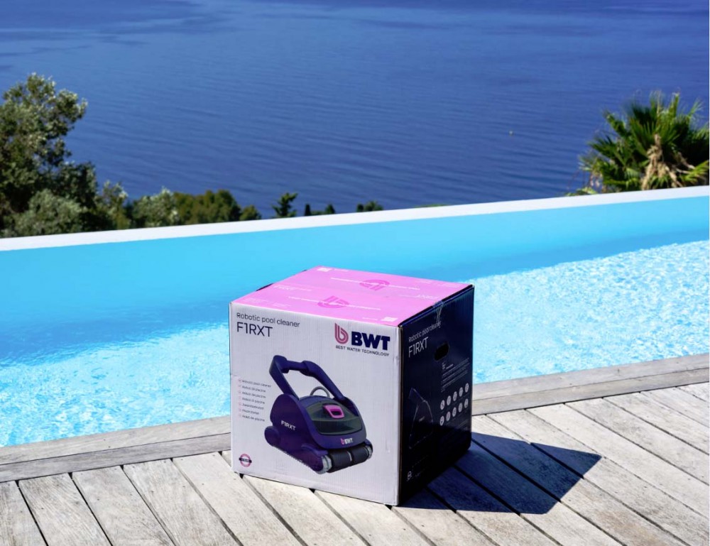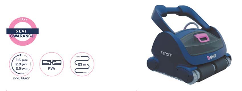 Nowy odkurzacz basenowy do czyszczenia basenów F1RXT marki BWT. Do wszystkich rodzajów basenów (poliester, folia PVC, ceramika szorstka), czyści dno i ściany oraz linię wody Przeznaczony do niecek o długości do 15m. Poczuj moc inżynierii BWT dzięki nowemu robotowi czyszczącemu basen F1RXT, zaprojektowanemu w oparciu o opatentowaną, najnowocześniejszą technologię. Odkurzacz przeznaczony również do użytku w małych hotelach, pensjonatach, ośrodkach wypoczynkowych, przy utrzymaniu rygoru 3000 roboczo godzin przez 5 lat.
