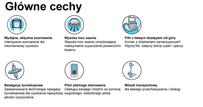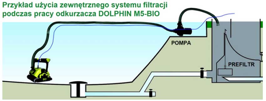 Odkurzacz automatyczny Dolphin M5 BIO przeznaczony jest do czyszczenia stawów kąpielowych i basenów biologicznych, o długości do 15m. Odkurzacz efektywnie czyści i odkurza dno, ściany i linię wodną zbiornika i jest pierwszym automatycznym odkurzaczem, w którym do filtrowania wody można wykorzystać zewnętrzny filtr basenowy lub pompę obiegową. Aby skorzystać z tej opcji w celu usunięcia z basenu dużych ilości zanieczyszczeń (liście, glony) należy wyjąć jeden wkład filtracyjny i w jego miejscu wstawić nasuwkę z obrotnicą dostarczaną wraz z odkurzaczem. Do obrotnicy należy podłączyć rurę ssącą (opcja), której drugi koniec należy podłączyć do filtra basenowego lub pompy obiegowej, podobnie jak przy stosowaniu odkurzacza ręcznego. Po zaślepieniu jednego otworu w pokrywie dolnej można uruchomić odkurzacz w trybie automatycznym, bądź też za pomocą pilota wybrać tryb pracy ręcznej i kierować odkurzaczem w miejsca wymagające szczególnego czyszczenia.