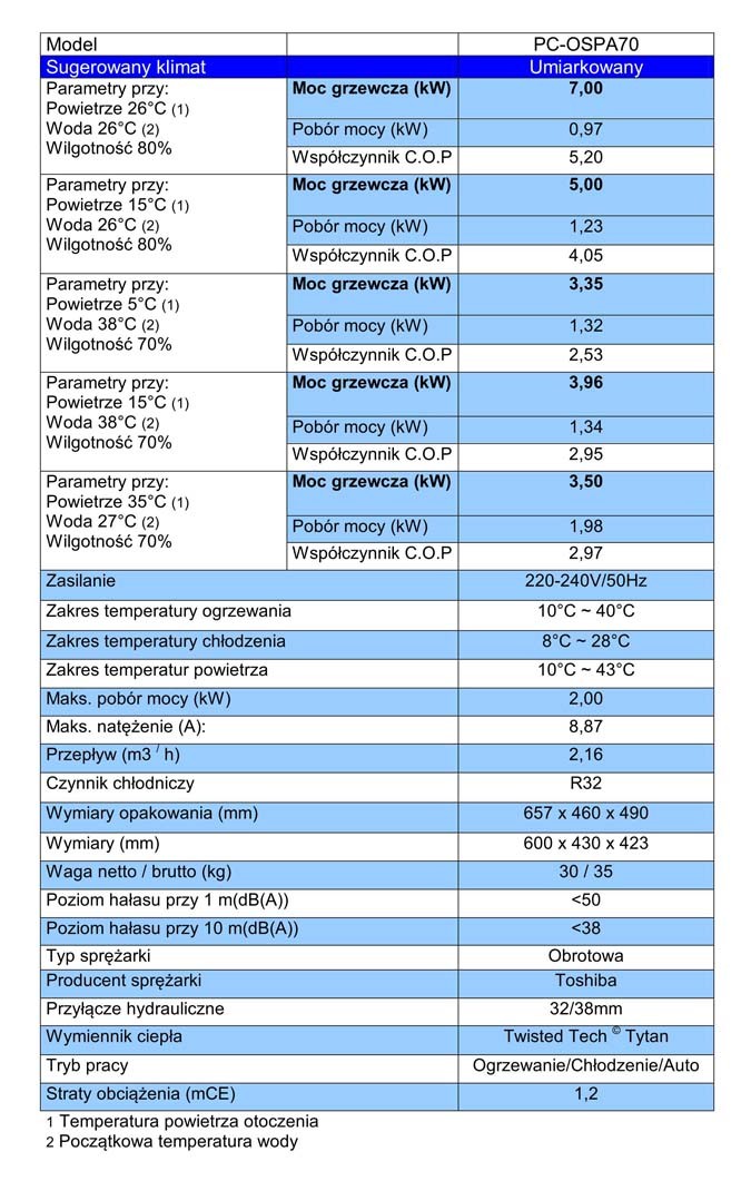 • Moc grzewcza przy temp. powietrza 15st.C/wody 5 st.C/wilgotności 70%: 1,4kW
