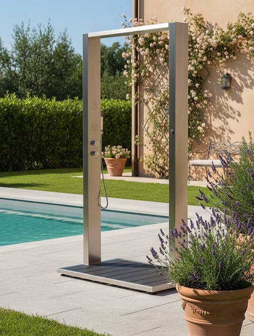 Prysznic wykonany ze stali nierdzewnej V2A, z szerokim prysznicem głowy i dwoma bocznymi prysznicami ciała