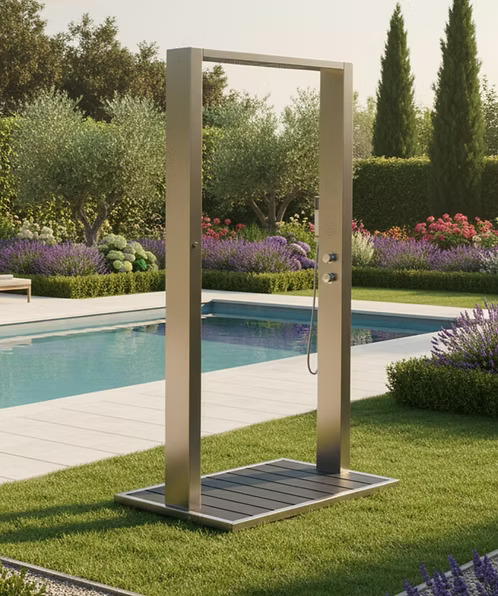 Prysznic basenowy Samoa, wszechstronny prysznic dla całej rodziny. Prysznic posiada szeroką głowicę prysznicową, dwa połączone ze sobą prysznice do ciała oraz słuchawkę prysznicową. Ciepłą lub zimną wodę miesza się za pomocą regulatora, w zależności od tego, jak się czujesz. A potem marsz wodny! Czyste wellness w Twoim ogrodzie. Oczywiście prysznic wykonany jest z wysokiej jakości stali nierdzewnej.
