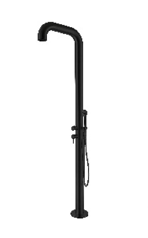 Prysznic basenowy Santos Black, z baterią prysznicową do spłukiwania ciała, oraz z natryskiem na głowę - główka prysznicowa, jest smukły i elegancki. Prysznic wyposażony w zabezpieczenie przed zamarzaniem za pomocą taśmy grzewczej z termostatem - zasilanie 230V dzięki czemu zapewniona jest jego mrozoodporność.