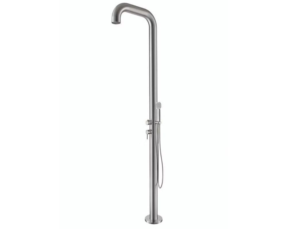 Prysznic basenowy Santos, z baterią prysznicową do spłukiwania ciała, oraz z natryskiem na głowę - główka prysznicowa, jest smukły i elegancki. Prysznic wyposażony w zabezpieczenie przed zamarzaniem za pomocą taśmy grzewczej z termostatem - zasilanie 230V dzięki czemu zapewniona jest jego mrozoodporność.