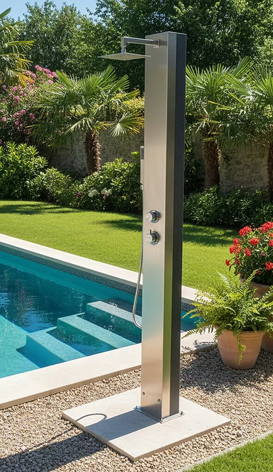 Prysznic basenowy, ogrodowy solaryczny Trinidad Solar z frontem prysznica wykonanym ze stali nierdzewnej V2A. Wyposażony w dwa zawory (zimna i ciepła woda).