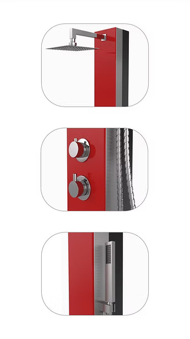 Prysznic basenowy, ogrodowy solaryczny Saba Solar - kolor czerwony z obudową ze stali nierdzewnej V2A. Front prysznica wykonany ze szkła hartowanego bezpiecznego o grub. 8mm